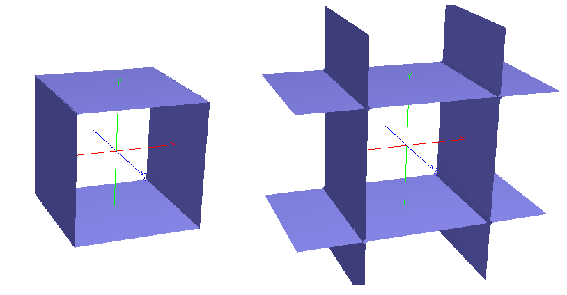 Cylinder Surface with a Rectangular Cross Section Cylinder surfaces with rectangular cross sections are interesting mathematically because they have branches. Although the outer trimming volume is usually set to trim these branches away, they are nonetheless present. The image below shows two copies of the same square cylinder. The surface on the left has an outer trimming volume which is sized such that the branches are trimmed. The surface on the right has an oversized outer trimming volume and shows the presence of the branches.