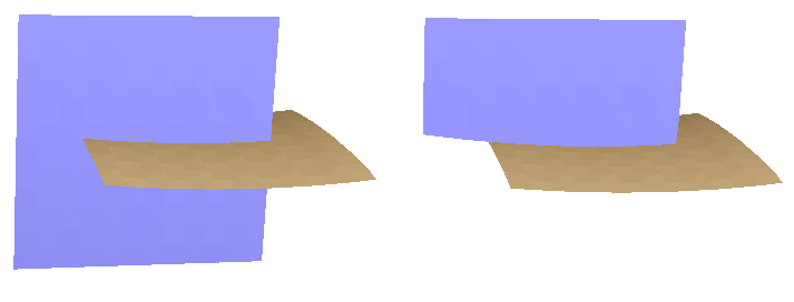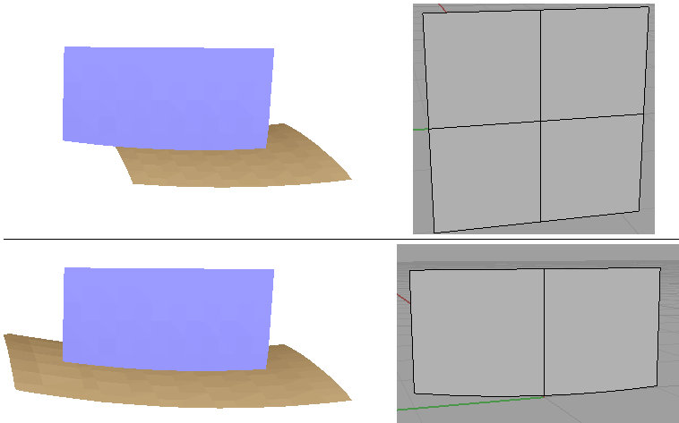 The resulting CAD exports for the case of a plane partially cut through by a trimming surface and for the case of a plane fully cut by a trimming surface are shown below. It is critical to note that the plane only partially cut by the trimming surface does not export correctly to CAD.