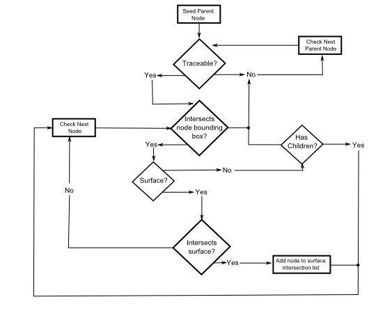 The hierarchical raytrace search algorithm searches the FRED geometry nodes starting with a seed parent node and then works down through the children, grandchildren, etc. until all progeny nodes have been searched. The intersection determination proceeds in the logical manner depicted by the following flowchart.