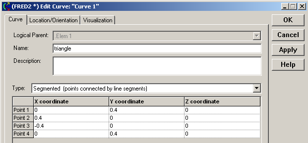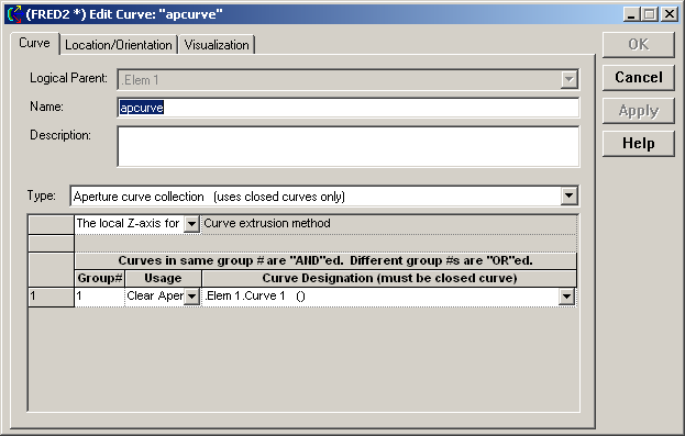 The following images show the segmented curve definition, aperture collection curve and the resulting clipped field (original field was a simple plane wave).