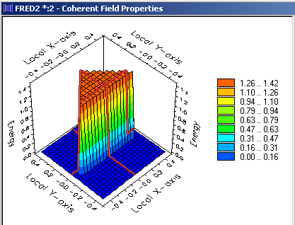 This feature creates a new coherent rayset using Gabor synthesis from a user-calculated complex field. The new rayset is synthesized from a collection of Gaussian beamlets whose amplitude, phase and directional distribution are determined by the complex field characteristics as well as the area and spatial resolution over which the original field was calculated. The Gaussian Beamlet Parameters in the Coherent Field Synthesis dialog allow the appropriate method of synthesis to be selected from possibilities spanning two limiting cases; the pure positional synthesis, which creates gaussian beamlets on a rectilinear grid and the pure directional synthesis, which creates all beamlets at the center of the analysis surface area each having different directions, amplitudes and phases. The synthesized rayset will propagate along the +Z axis of the associated analysis grid.