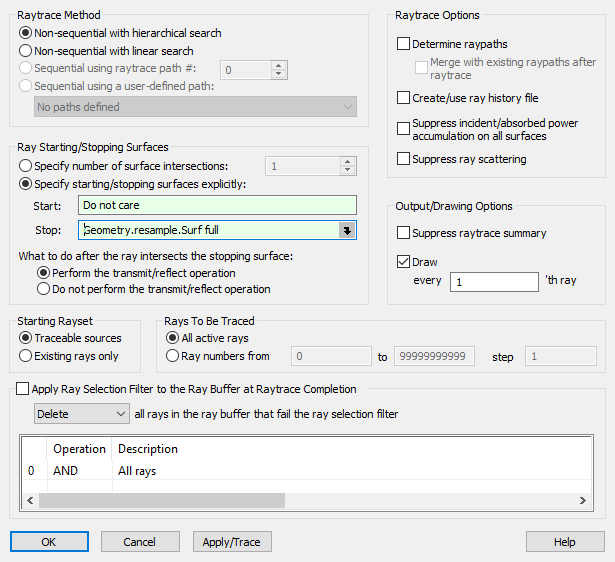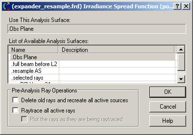 From the Advanced Raytrace dialog, trace the source rays to the resampling plane using the resampling plane "Geometry.resample.Surf full" as the stopping surface.
