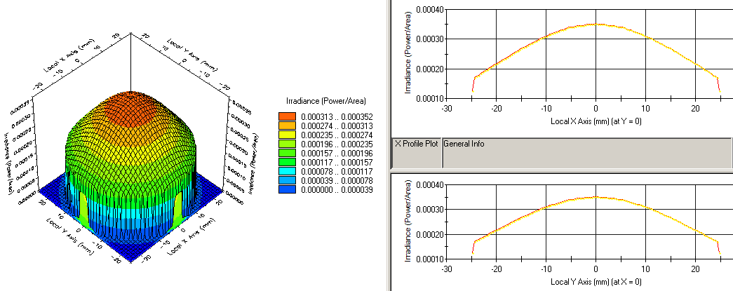 Finally, calculate the irradiance pattern of the rayset transmitted through the PCX lens using the Analysis Surface "Obs Plane". The pattern shown below is indicative of a highly truncated yet collimated Gaussian beam.