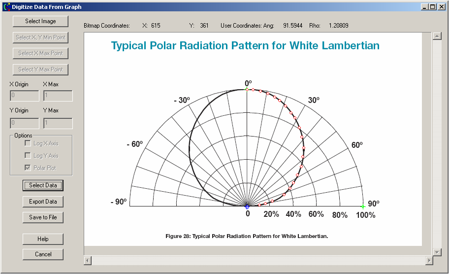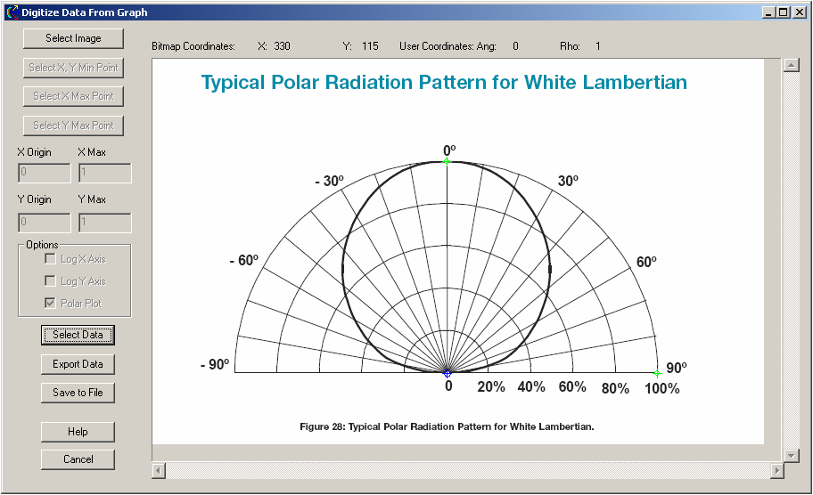 The Digitization Tool (or Digitizer) allows the user to digitize data points from a graph, plot, lens drawing, etc. from an image file. The user can import an image file in a number of different image file formats including BMP (bitmap), PCX (PC Paintbrush), JPEG, PNG, GIF, TGA (Targa), or TIF. From the image file, the user will identify the graph origin, the X-axis scale, and the Y-axis scale and select data points for acquisition.