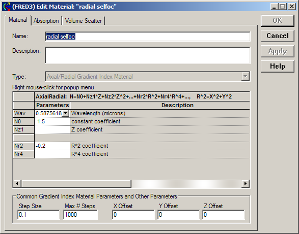 As an example, the Axial/Radial GRIN material shown below expresses the index in a functional form N(X,Y,Z). For materials of this type, X, Y and Z are expressed in the coordinate system of the surface to which the material is assigned. Therefore, this single definition can be applied to any number of elements within a FRED model and will, according to the position and orientation of a given element or surface, adapt the spatial definition of N(X,Y,Z) appropriately. This feature allows for further modification of the position and/or orientation of the material as illustrated below.