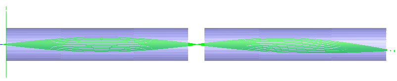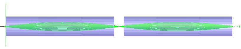 The resulting trace through the two rods after this re-orientation is shown below where the rays are deviated from the axis of symmetry only in the second rod.