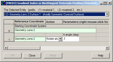 The Gradient Index or Birefringent Material Position/Orientation dialog as shown here can be used to alter the orientation of the GRIN definition in one of the two rods without the need to define a second, rotated GRIN material. In this case the GRIN material is rotated by 2 degrees about the X-axis of Lens 2.