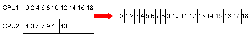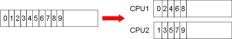 Consider tracing ten rays using two CPUs. Upon executing a trace command, FRED allocates individual rays to the available processors in an ordered fashion as illustrated below.