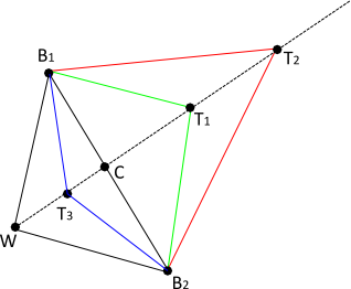 Although the simplex can represent an arbitrary n-dimensional function, the 2-D case serves a useful illustration of the simplex method. Consider a 2-D function which has been sampled at three locations within the variable space to form a triangle, which is the simplex (shown below). These points can be evaluated as best (B1), second best (B2) and worst (W). In order to improve the simplex, we wish to move the worst point to a new position and improve the merit function evaluation. Three operations are potentially performed on the simplex to move point W, reflection about B1B2, an expansion and a contraction. The following steps would be taken: