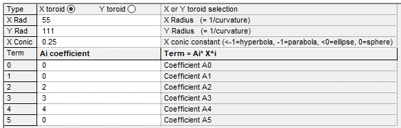 •The r5 coefficient can be accessed by using the user-defined script variable shown below. The convention for idx in the script functions SetAsphereOddCoef() and GetAsphereOddCoef() is idx = (n-1)/2, where n is the order of the odd aspheric coefficient being accessed.
