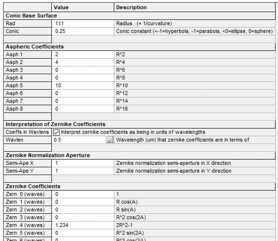 •The Asph 5 coefficient can be retrieved by using the Aspheric Even Power Coefficient variable type and setting Index = 5.