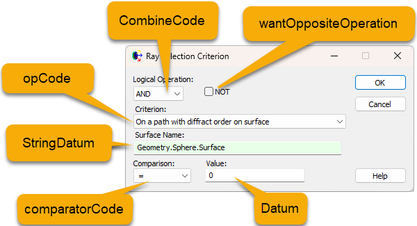 For example, a common ray selection criteria is "Rays on the specified surface". In order to specify a ray selection criteria of the type, "Rays NOT on the specified surface", the T_RAYFILTEROP data structure configuration would be the following, where the wantOppositeOperation is used to flip the conditional logic: