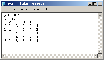 A properly formatted text file can be used for reading data from a file, which should have a *.dat extension. This option can be accessed by right mouse clicking in the data spread sheet area and selecting "Read from file" from the list menu. The file contains two header lines, the first line reading "type mesh" and the second line reading "format". Following the header lines are rows of data points with the first row and first column specifying the X and Y positions. The remaining data points represent the Z-values.