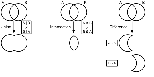 The Element Composite construct allows for the creation of complex solid geometries by application of the union, intersection and difference boolean operations to combine Element Primitives and/or element composites. Once specified, the composite is maintained as a dynamic solid which will update as its component elements are modified. The boolean solid operations are depicted in the diagram below. Please note that only the Difference operation has an order dependency.