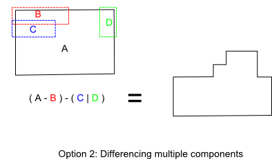 The surface coincidence issue cascades when the final structure is formed by the boolean operation A | ( B | C ). Similarly, either the mating interface between A and ( B | C ) is coincident or the side walls are coincident. Therefore, Option 1 is only possible if the user is willing to sacrifice precision by slightly under-sizing or over-sizing the component elements in order to eliminate the surface coincidence. Although Option 2 requires managing an additional component, the geometry can be constructed precisely to size without coincident surfaces.