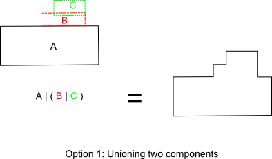 Take a closer look at how Option 1 would be implemented by unioning multiple elements. The first structure, ( B | C ), has four potential coincident surface areas depending on the configuration. When elements B and C are just in contact, the top surface of B and the bottom surface of C are coincident.