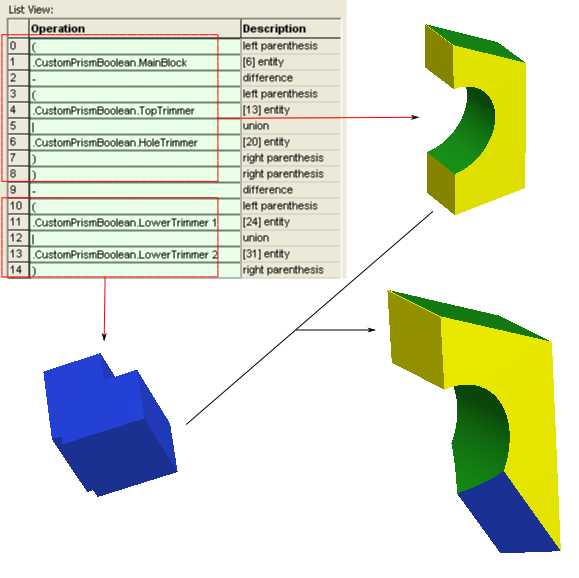 The operation list view for the element composite is shown below. Parenthesis can be used to organize the operations into manageable groups, effectively making each group of parenthesis its own element composite. For example, entries 0 - 9 result in the solid shown in the upper right, created by subtracting the top block and rod from the main body block. Entries 10 - 14 result in the solid shown in the lower left, created by unioning the two tilted blocks (shown in blue above). The completed prism is created by differencing the two parenthetical groups.