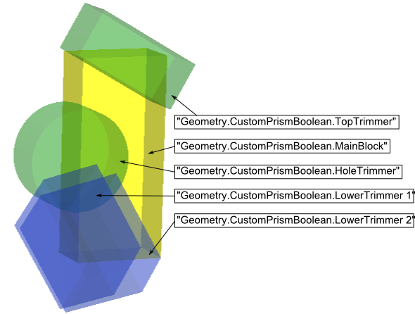 To illustrate the application of element composites, a custom prism is created using boolean operations. Consider the following system composed of five element primitives (four blocks and a rod), which are children of an element composite node called "CustomPrismBoolean". In the image below, the component element primitives are shown in position before applying the logical boolean operations to construct the prism.