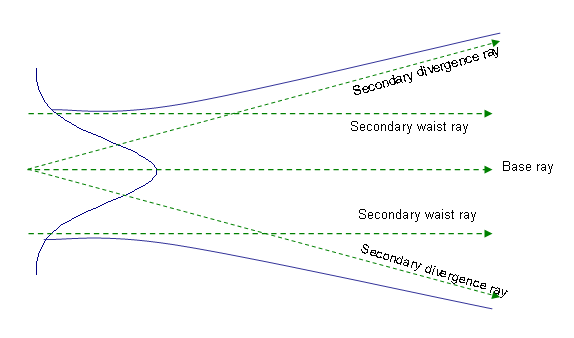 For illustration purposes, the Figure below shows a base ray and two in-plane pairs of secondary rays. An additional set of four secondary rays lie in the orthogonal plane. The waist rays initially trace parallel to the base ray at a distance determined internally by the grid spacing and the overlap factor and corresponding to Overlap*wo. The divergence rays begin coincident with the base rays and trace a trajectory asymptotic to the far-field divergence angle, q.