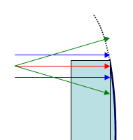 Consider Case 1 below in which a coherent beamlet intersects a lens surface near the edge of its clear aperture. The red ray is the base ray, the blue rays are the waist rays and the green rays are the divergence rays. Based upon the diagram, one might be lead to conclude the the outermost divergence ray is clipped by the lens aperture; this is not the case! FRED actually extends the surface profile based on its mathematical definition, and in the particular case shown FRED has no problem intersecting the outermost divergence ray with the surface.
