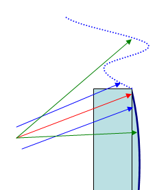 Consider now a sphere, cylinder or ellipse as shown in Case 2 below. There exists no mathematical extension of the surface profile such that the upper divergence ray have an intersection. As a result, this beamlet fails the intersection criterion and is halted at the sphere.