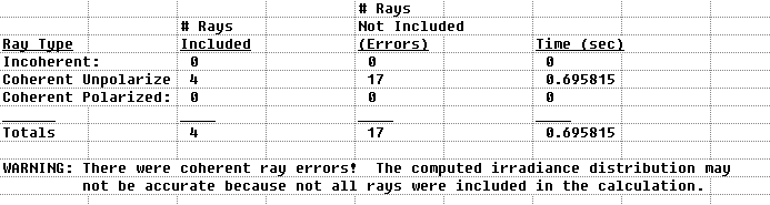 As noted in the Individual Beamlets section above, the phase of an individual beamlet must remain quadratic to within a l/4 tolerance in order to be considered a "valid" Gaussian beamlet. This determination is made at the time a coherent field calculation is performed and the number of beamlets included, or excluded, in the calculation will be reported in the output window at the time of the analysis. If rays are excluded from an analysis, the user should test the sensitivity of the excluded ray counts by returning to the source definition, decreasing (or increasing) the ray sampling of the source, and performing the raytrace and analysis again. The point at which there are no coherent ray errors reported in the output window, for either the raytrace or the analysis calculation, represents the best sampling of the source that can be achieved for the system without further user intervention. Advanced methods for performing spatial or angular resampling along the beam propagation path are available, if the source sampling is determined to be insufficient for the application.