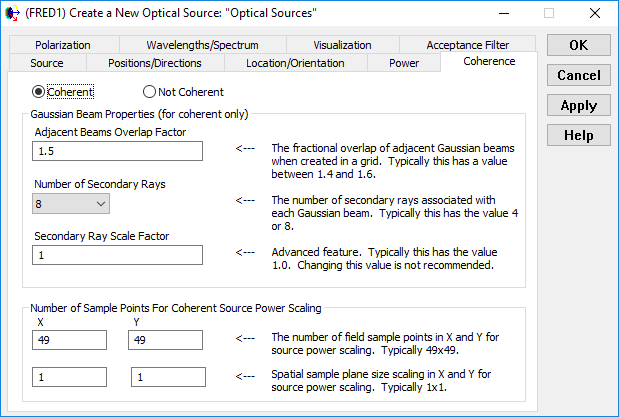 The individual beamlets comprising these sources can overlap one another. In all cases except the Point Source, FRED determines the width of each Gaussian beamlet based upon the user-defined grid spacing and an overlap factor. The default value for this Adjacent Beams Overlap Factor is 1.5, though the user has control of the overlap value through the Coherence Tab on the Detailed Source dialog by specifying the "Adjacent Beams Overlap Factor".