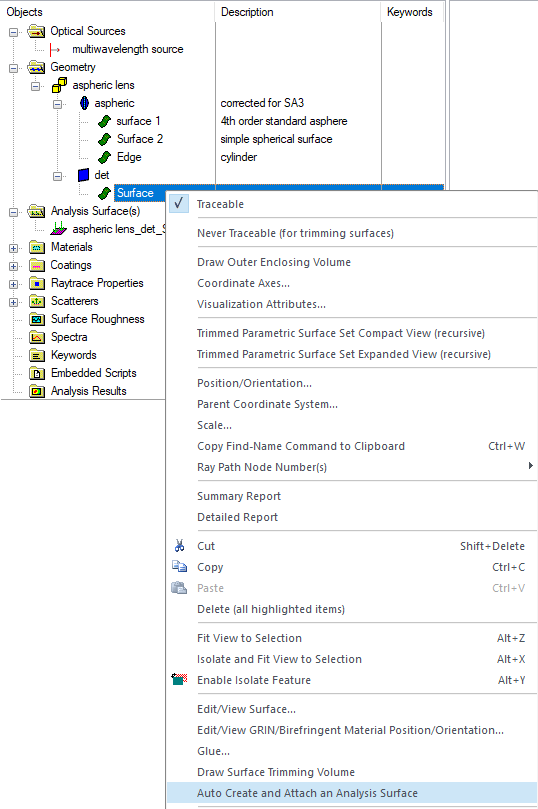 Finally, expand out the object tree so that you can see the surface underneath the "det" element primitive in the "diffractive lens" subassembly. As was done previously, right mouse click on the surface and choose, "Auto Create and Attach an Analysis Surface".