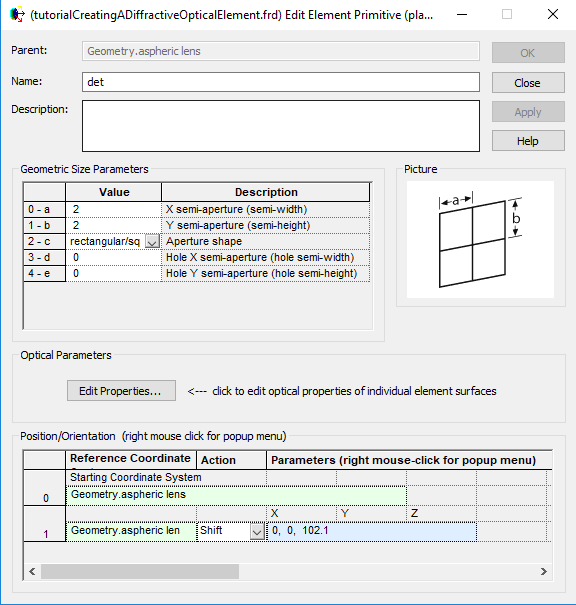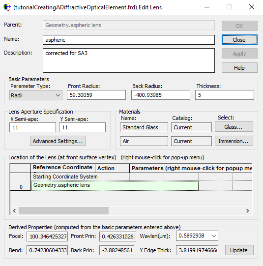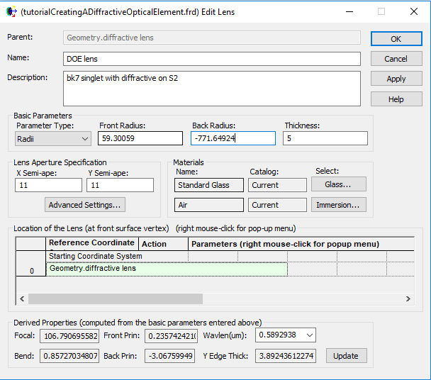 Open the dialog for the lens node of your "diffractive lens" subassembly and edit the name, description, and radius of the back surface. Hit OK on the dialog to accept the changes.
