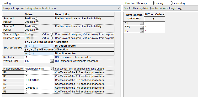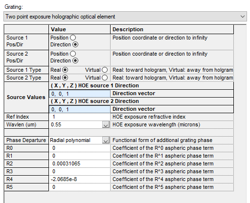 Use the drop-list selection box on the Grating section to choose the grating type as, ‘Two point exposure holographic optical element’. Next, edit the point source locations and wavelength. In this example, we are accepting the default point source locations. That is, both point sources are located at infinity because we have specified propagation direction instead of a physical location. The former results in a traveling plane wave, the latter in a convergent or divergent spherical wavefront. In practice, either point source positions or directions are acceptable and they can be used in combination with one or the other. The direction of propagation is determined by the Real or Virtual setting. Selecting a Real point source tells FRED that the propagation between the source and the hologram plane has a positive path length. Conversely, the Virtual setting tells FRED that the propagation from the point source to the hologram plane represents a negative optical path length. As these settings are a matter of convention, you may need to experiment with the inputs, changing the Real and Virtual buttons and/or the sign of the diffraction order to achieve the desired grating effect. The X, Y, and Z locations refer to the physical location of the point(s) in the case of a position specification, or, when normalized, the direction cosine of the plane wave in the case of a direction specification. Point source locations and directions are always measured in the local coordinate system of the surface. By accepting the defaults, we are interfering two coincident plane waves, traveling in the same direction and having the same optical path length. This results in a plane of constant phase at the hologram. Without the addition of additional phase departure terms, the grating will have no effect. The exposure wavelength determines the grating frequency or, equivalently, the fringe spacing of the interference pattern formed by the two sources. In this example, change the exposure wavelength from the default setting of 0.589 microns to 0.55 microns. The exposure wavelength can take any value, independent of the source wavelengths defined in the model.