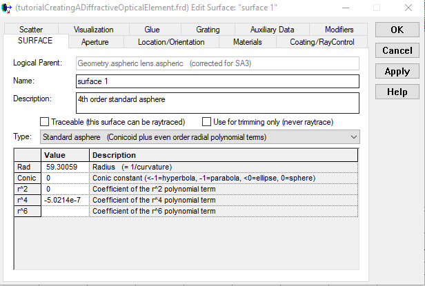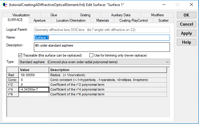 Expand the tree view so that you can see "Surface 1" of the "DOE lens" element. Double click on the "surface 1" node to open its dialog and then change the value of the r^4 aspheric term to -4.34355E-07 and then hit OK on the dialog.