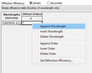 Right mouse click in the diffraction efficiency table area to bring up a context menu that allows you to append, insert or delete additional wavelength rows or diffraction order columns from the spreadsheet.