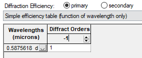 On the right hand side of the dialog, in the Diffraction Efficiency section, use the drop-down menu to select, "Simple efficiency table" as the diffraction efficiency specification type. Left click in the column header where the diffraction order is specified to make the up/down spinner control appear, which allows you to change the diffraction order. Click on the up or down arrow to add or subtract from the order. For this example, use –1 as the diffraction order.