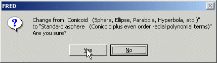 Expand the aspheric lens node on your tree so that you can see the individual surfaces. Right mouse click on the first surface of the lens node and select, Edit/View Surface" from the list of options. In the resulting dialog, change the surface type from Conicoid to Standard Asphere using the Type drop down list. Depending on your Preferences, you may see the following dialog