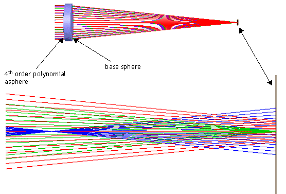 Trace and render the rays, as shown below. Note the blue (short wavelength) comes to a focus before the longer green and red wavelengths. This is axial chromatic aberration, which is defined as the variation in focal length with color. It arises from the spectral dispersion inherent to optical materials. The aspheric front surface has removed the spherical aberration, so each color comes to a sharp focus.