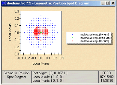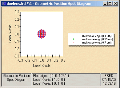 Perform another Positions Spot Diagram analysis using the analysis surface for the diffractive lens detector surface. The spot distribution for the blue and red wavelengths now match, while the residual secondary spectrum error gives a smaller spot size for the 0.55 micron wavelength.