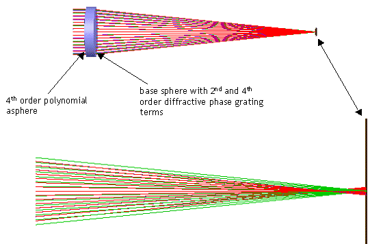 Aspheric lens with a diffractive surface to correct axial chromatic aberration In this section, we will create a new version of the geometry so that we can modify the lens prescription to use a holographic grating in order to correct for the axial color.