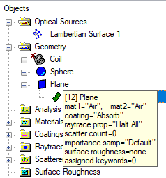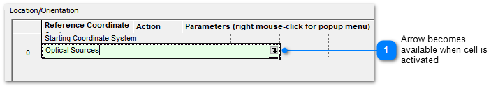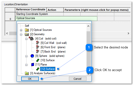 The Entity Picker interface is used to select entities on the object tree for various applications. For example, the entity picker is used to select a coordinate reference system when positioning an object as shown below. This interface appears in many locations through out the software including boolean operations lists, stray light report, single raytrace and the best geometric focus analysis.