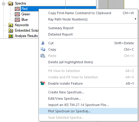 The spectral power distributions of the red, green and blue spectrum nodes can be viewed by right mouse clicking on the spectrum node and choosing the "Plot Spectrum" option.