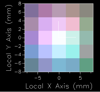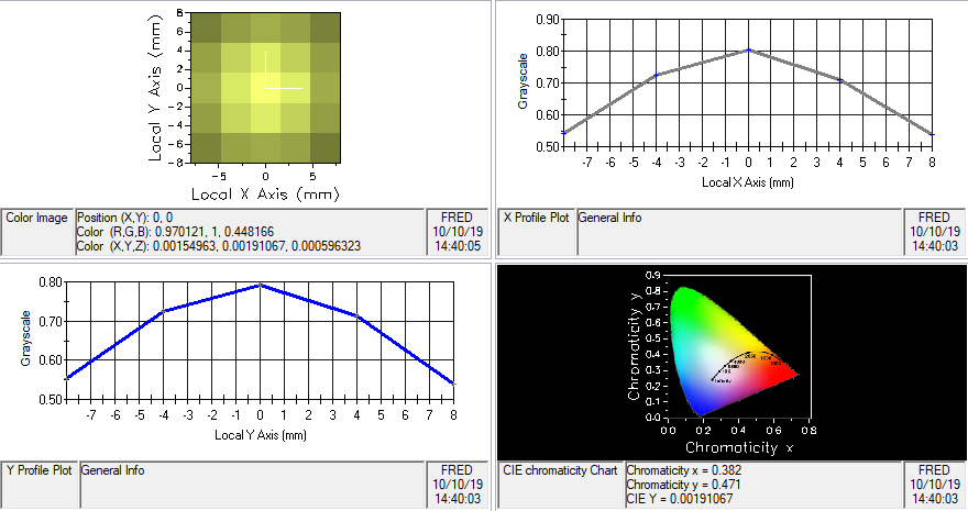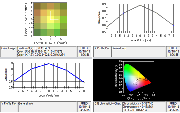 If a raytrace and analysis is performed using the following sequence, then the resulting color image on the screen appears as shown in the image below where the center pixel of the distribution has x,y chromaticity coordinates of approximately (0.3, 0.3). 1.Raytrace > Trace All Sources 2.Analyses > Color Image
