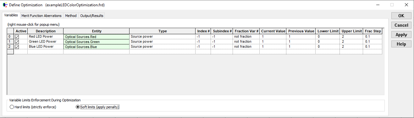 Defining optimization variables With the optimization configuration dialog opened, the variables are defined on the "Variables" tab. Each variable specification is defined on a single row in the spreadsheet, indicating the entity in the model whose property is being varied, the type of property being varied, and the lower and upper range limits that the variable is allowed to traverse during optimization. In this example, the variable Type is going to be the power emitted by each of our three LED sources and, consequently, the Index #, Subindex #, and Fraction Var # specifications for each variable can be ignored. In other variable type specifications, one or more of these specifications may be required (see the Optimization Variables Help topic for more information on these specifications). The source power for each LED model will be allowed to vary between 0 and 2 Watts. The Frac Step setting controls the step size of the initial variable search at the start of optimization, with a value of 0.1 indicating that the variables will step 10% of their limits range (Upper Limit - Lower Limit). The default setting for Frac Step is 0.1 and adjusting this value can affect the outcome of the optimization.