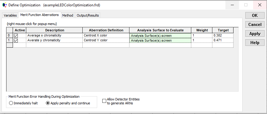 In our example, we are optimizing the powers of the three LED sources in order to achieve a specific color distribution on the screen plane. In particular, the color distribution will be specified as x,y chromaticity coordinates in the CIE 1931 color space by using the "Centroid X color" and "Centroid Y color" aberration options. For our LED application, the centroid color options will drive the average color across the entire screen. The distribution that we wish to evaluate for its chromaticity coordinates is gong to be calculated by the "screen" analysis surface and we want the target x,y chromaticity coordinates to have a value of (0.382, 0.471).