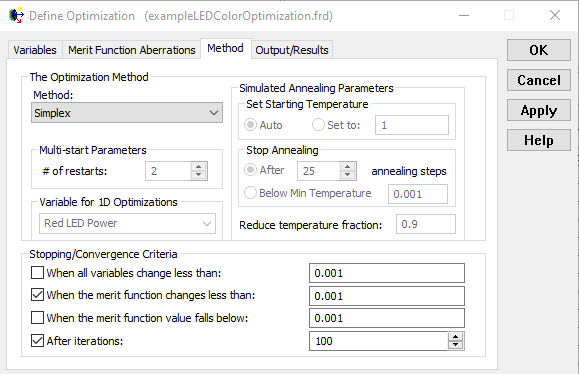 Defining the optimization method FRED has a number of different optimization methods, but we will use the general purpose Simplex option for our LED example. In addition to specifying the optimization method, we need to specify when the optimization should be considered to have converged. We specify that the optimization will stop when the merit function value changes by less than 0.001 OR after 100 iterations.