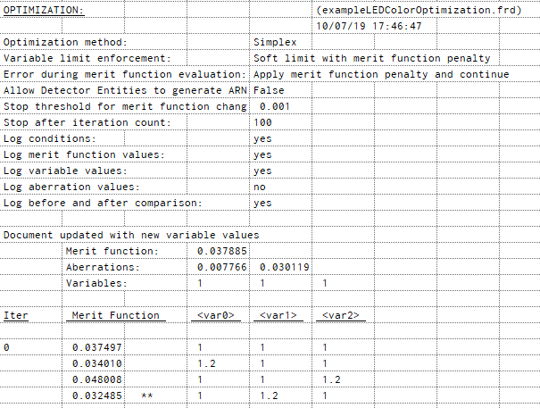 In this example, the optimization is considered converged when the 100 iteration limit is hit. The final value of the merit function and variables are reported to the output window as well as a comparison of the variables and aberration values before and after the optimization. As indicated in the image below, the "after" values for the aberrations, which are the x,y chromaticity coordinates, achieved values of 0.38 (X chromaticity) and 0.47 (Y chromaticity).