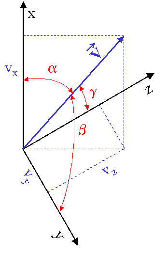 The direction cosines, A, B, and C, are simply the cosines of the angles, a, b, and g, between a given vector, V = ( vx, vy, vz), and the positive local X, Y, and Z axes.