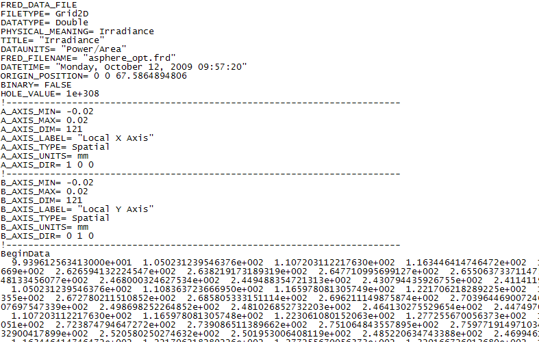 Shown below is an example of the FRED Grid Data file format. The header information instructs FRED how to interpret and display the data. The file data follows the line entry BeginData. In the scripting language the header information can be set using various ARN functions and subroutines.
