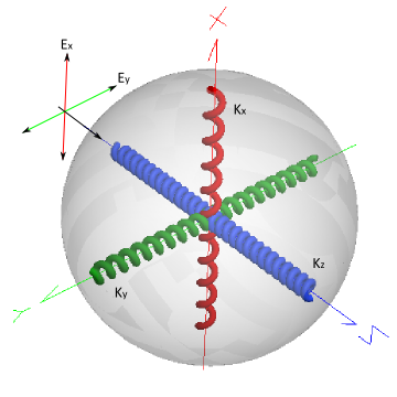Most optical materials are isotropic, which implies that the effective refractive index is constant with respect to propagation direction within the material. Materials which exhibit anisotropy in their refractive index give rise to unique polarization characteristics which can be used to construct polarization sensitive optical elements. Consider the diagram below which represents a charge shell bound by springs having spring constants; kx, ky and kz. A wave is incident on the system propagating along the Z axis and having electric field components Ex and Ey. The refractive index of the material represented by the spring model is determined by the difference between the E-field frequency and the natural frequency of the spring (related to k) such that stiff springs yield a low index of refraction and weak springs yield a high index of refraction. Assume that in the model below kx > ky. As the Ex and Ey components of the E-field propagate through the medium, the Ex component travels at a faster phase velocity compared to the Ey component. Upon exiting the material, the Ey component of the E-field will be time delayed with respect to the Ex component, potentially changing the polarization state of the outgoing wave field.