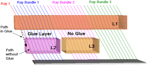 The example below illustrates both of these conditions. The top surface of the L2 lens is glued to the bottom surface of the L1 lens with the material common to both lenses so that the rays between them do not bend when refracting into the gap (see ray bundle 1). The top surface of the L3 lens is not glued to the bottom surface of the L1 lens, so the rays bend when they refract into the gap (see ray bundle 2). Note that the sides of all three lenses are absorbing.