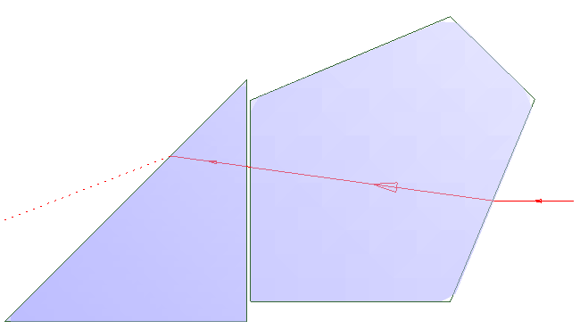 Important Note: There is one "pathological" condition in which the gluing algorithm will fail. The condition is best illustrated by the following example. The Pechan and Right Angle prisms shown below are constructed by extrusion of the in-plane segmented edge curves at their outlines. The extrusion is in-and-out of the page. Since the outlined edges form single surfaces in both cases, assigning a glue layer between the two prisms means that the glue assignment will be encountered at the initial intersection on the far right, not where the prisms are in close contact. Upon acknowledging the glue, the algorithm immediately attempts to intersect the surface to which it is glued, namely the vertical surface of the right angle prism. The algorithm does not check to see if the ray can intersect the initial surface (itself). As a result, the second intersection of the ray shown below would not be with the vertical surface of the Pechan prism but with the vertical surface of the Right Angle prism. The total number of intersections below would be three instead of the expected four. Therefore, the user should avoid gluing objects which are constructed from extrusions.