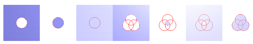 The operations illustrated above, from left to right are: 1. keep outside 2. keep inside = NOT(!) outside 3. multiple trim surfaces, but no trim 4. AND all: C1 & C2 & C3 5. AND NOT all: !C1 & !C2 & !C3 6. OR all: C1 | C2 | C3 7. OR NOT all: !C1 | !C2 | !C3